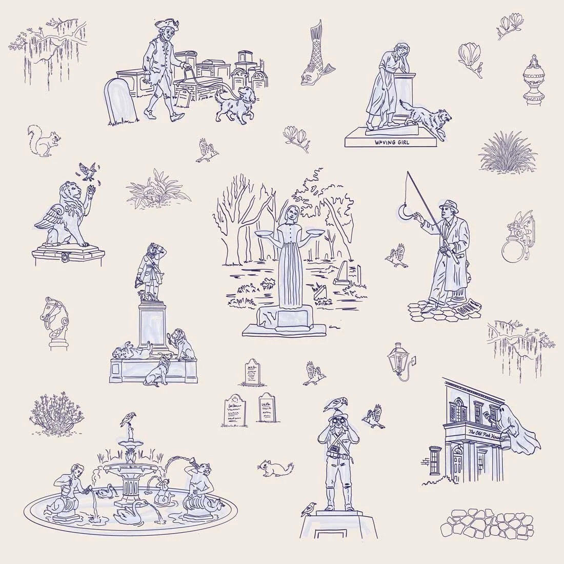 Cities are layered personalities, and Savannah’s layer of folklore is particularly thick. When I illustrate a city, I’m looking for the things that feel like the "furniture" of the place—the stuff you only notice when you stop trying to be a tourist and start listening to the local rumors.