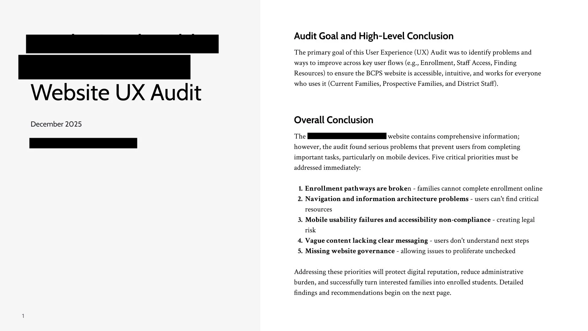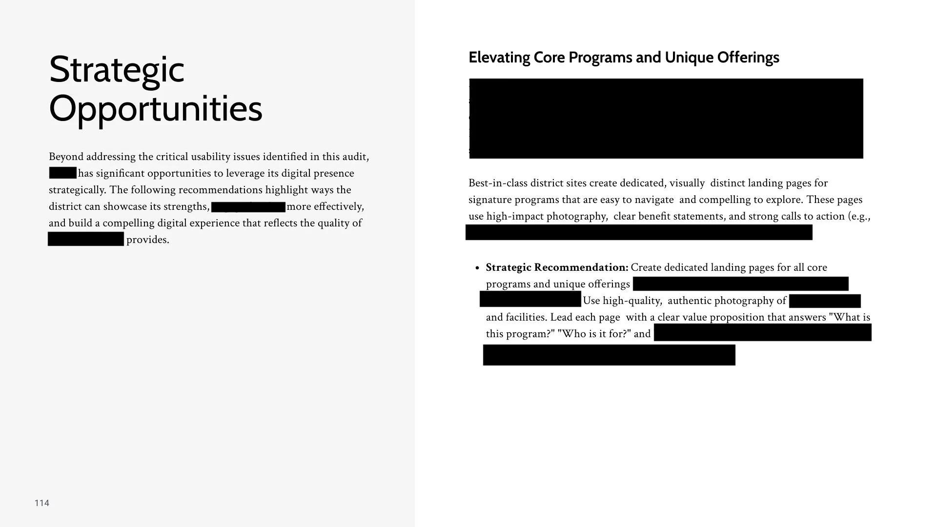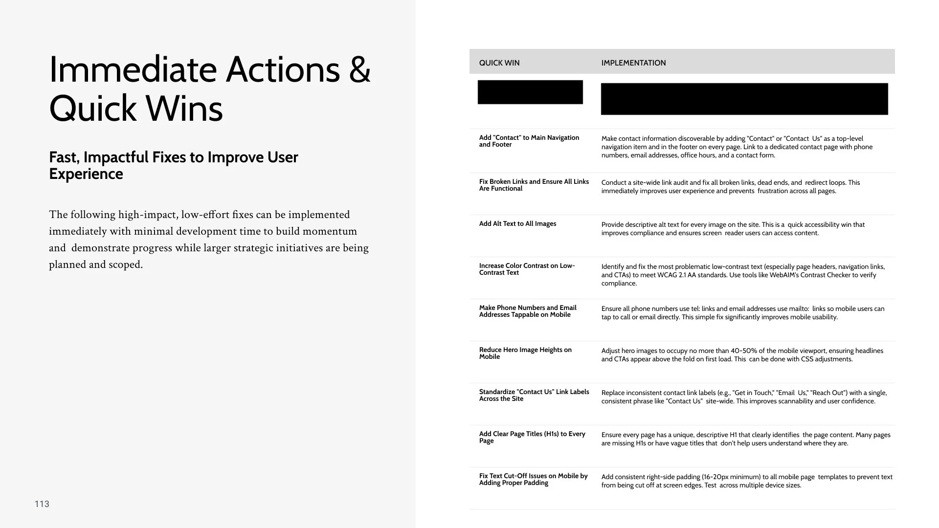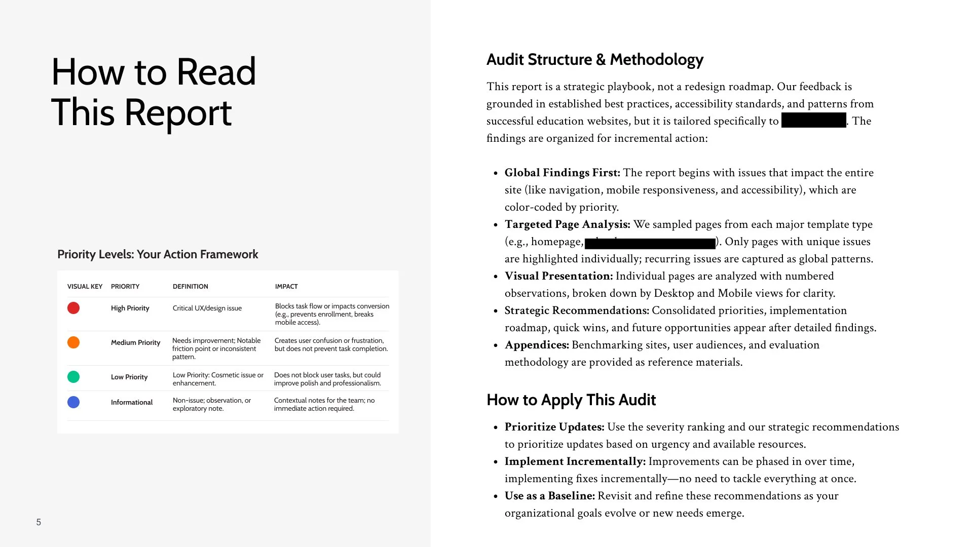 Strategic recommendations create direction without forcing premature redesigns. Screenshots shown here include light redactions to maintain client confidentiality while illustrating the audit structure.