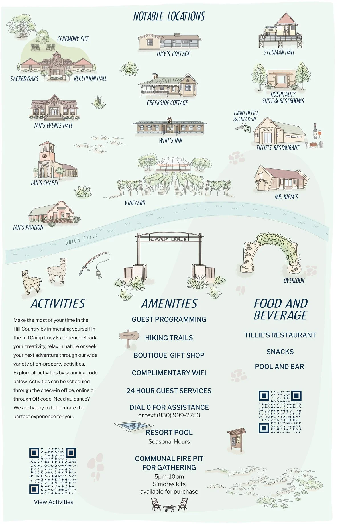 Set in the Texas Hill Country, Camp Lucy is a thoughtfully designed destination with multiple venues, accommodations, and gathering spaces spread across the landscape. The challenge wasn’t simply helping guests find their way — it was creating a map that felt like Camp Lucy: welcoming, refined, and rooted in place.