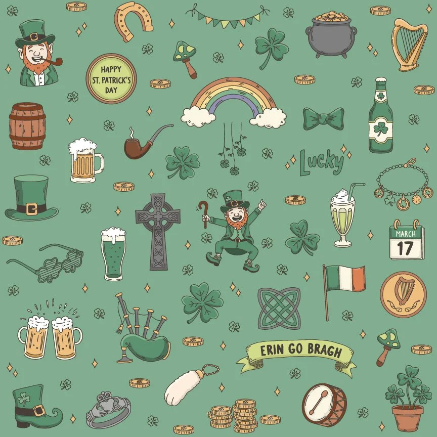 St. Patrick’s Day imagery carries centuries of meaning — luck and folklore, ritual and celebration, community gatherings and seasonal tradition. Rather than leaning into novelty or caricature, this pattern focuses on recognizable symbols rendered with restraint, clarity, and rhythm.