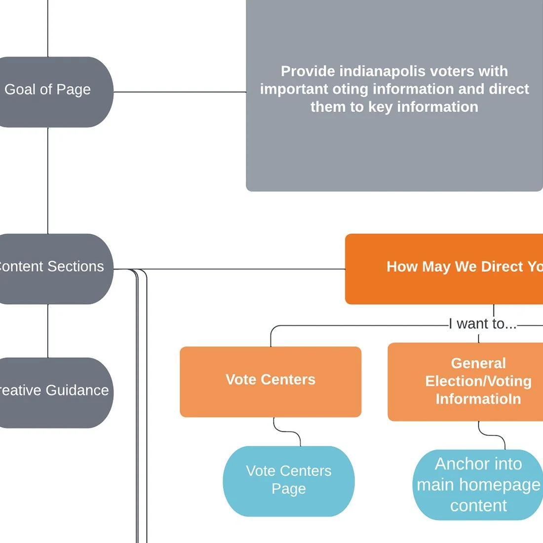 To begin, we put together a detailed digital audit as well as audience personas. Recognizing that new voters, occasional voters, and regular voters all come to the same place for information, it was important that we consider each of their different needs in our design. We studied user paths on the previous website, looked at other election board websites across states and counties, as well as websites with similar functionality in order to make the best recommendations for the new Vote.Indy.gov. With this research in mind, we pulled together a set of priorities, key functions, and examples to present and discuss with the clerk and the MCEB team.