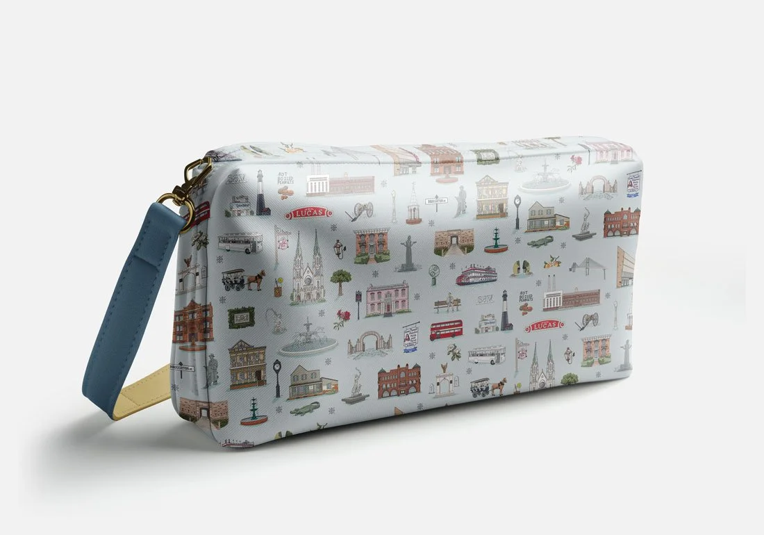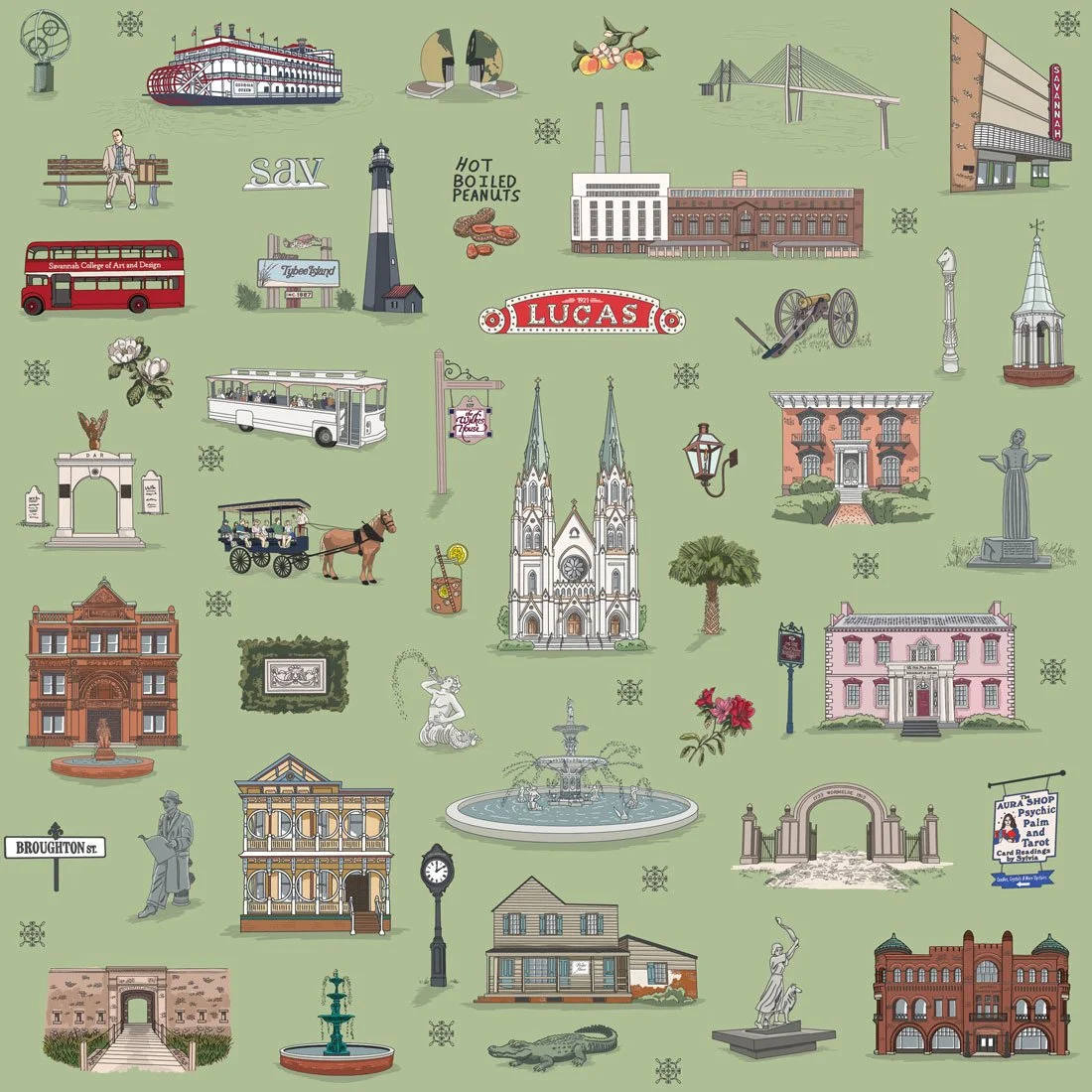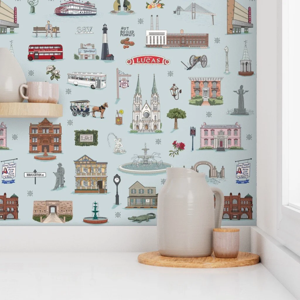 The illustrations work together as a full repeat, but each element is designed to stand alone. Forsyth Fountain on a notebook cover. The Waving Girl on a tea towel. Live oaks and Spanish moss as accent graphics.
