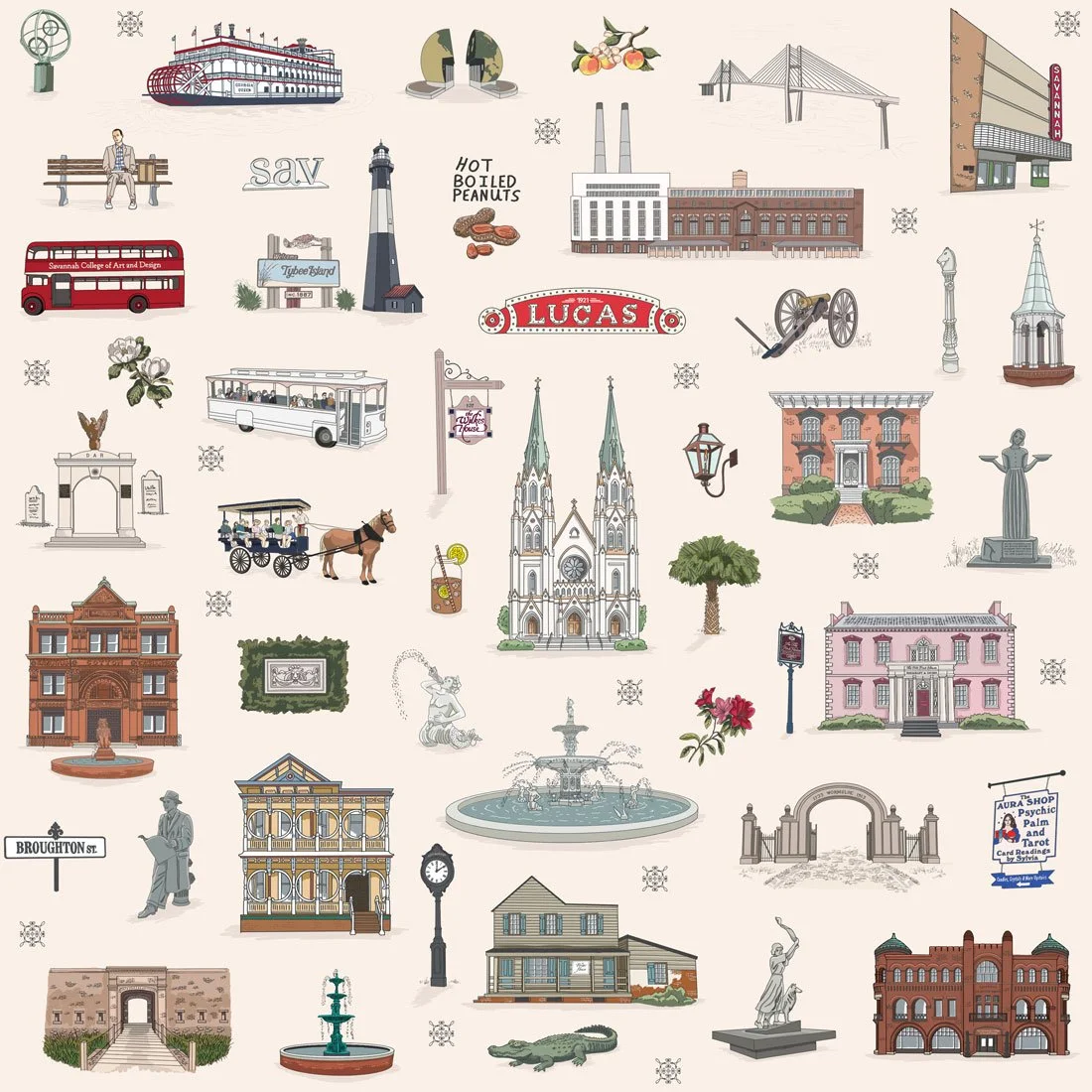 This pattern captures all of it—the landmarks everyone photographs, the details locals notice, and the coastal energy that makes Savannah exactly itself.