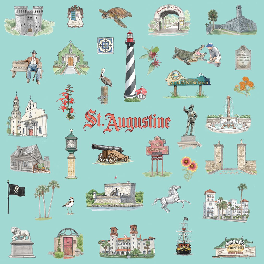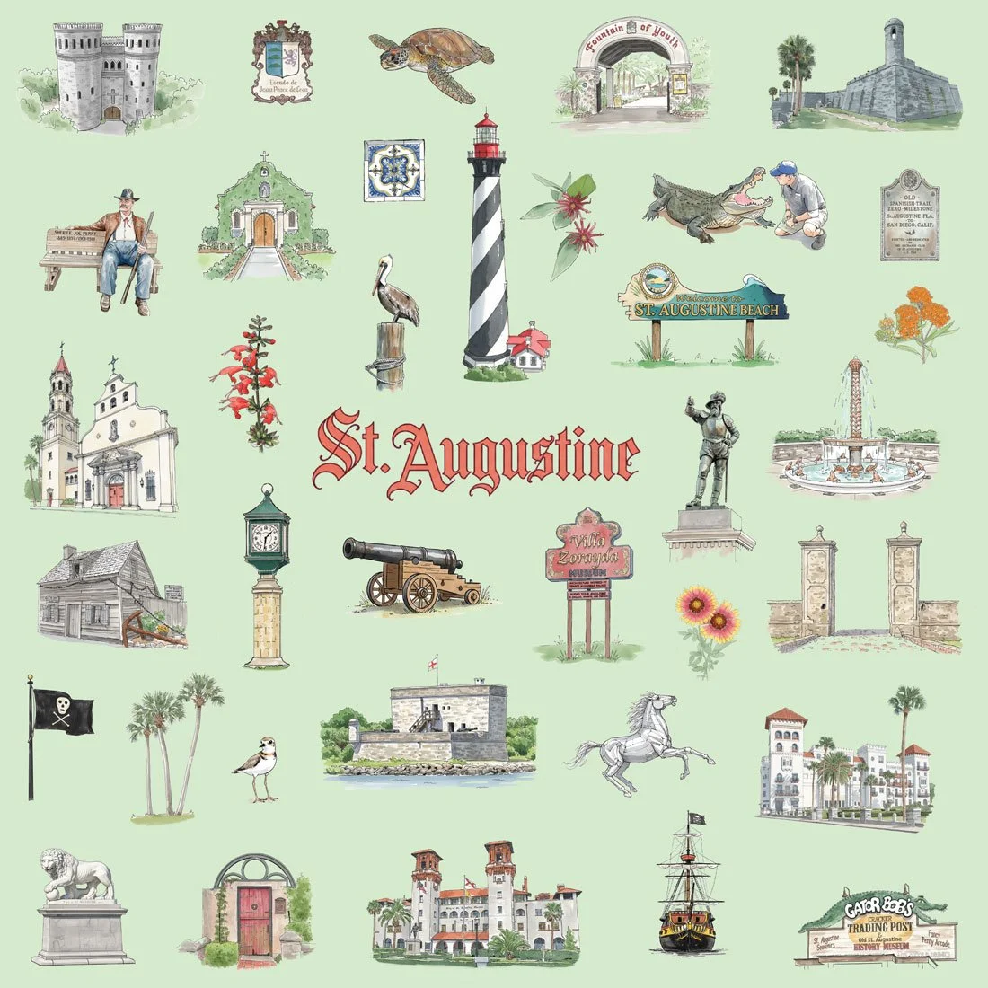 The Castillo isn't just any fort. The lighthouse isn't just any striped tower. The Villa Zorayda sign isn't just vintage—it's that specific brand of 1960s Florida optimism. Each element was selected for its role in St. Augustine's visual identity: serious history, kitschy tourism, and coastal Florida character all coexisting without apology.