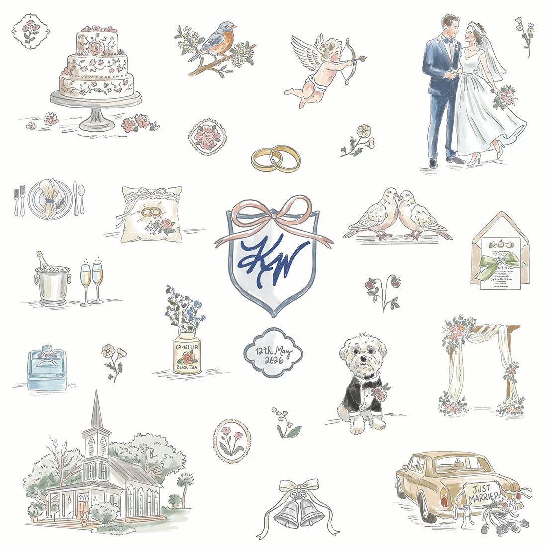 Wedding Day Storybook functions as more than a single pattern. Each illustrated element can stand on its own for use in invitations, signage, or small accents, while also contributing to a full repeat that feels consistent and intentional.